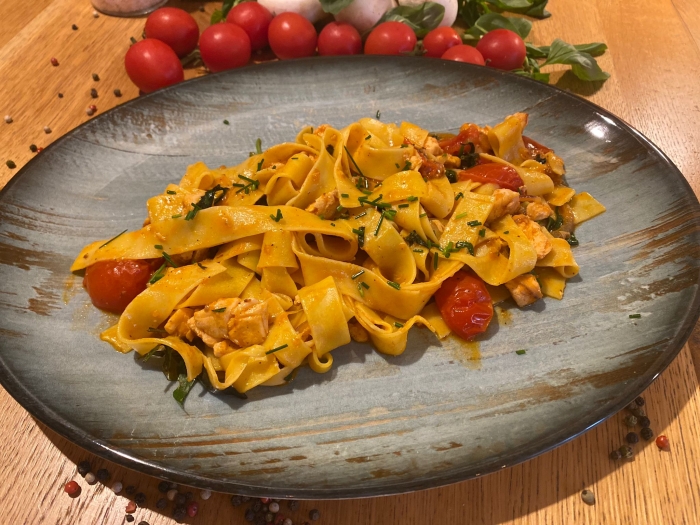 pappardelle, somon file, ceapă roșie, sos de roșii, cremă vegetală pt gătit, roșii cherry, chives, ulei de măsline extra virgin, oregano, sare, piper