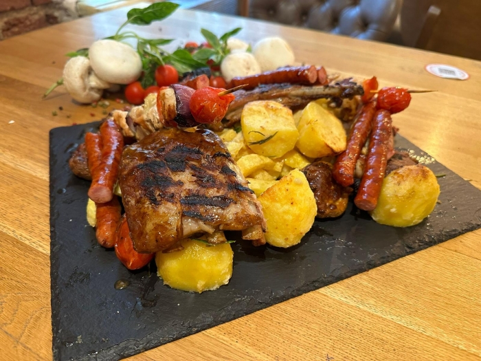 coaste de porc, cotlet de porc, frigarui de pui, carnati salsiccia, ciuperci umplute, servite cu cartofi prajiti cu parmezan , usturoi si busuioc si cartofi la cuptor cu usturoi si rozmarin, sare, piper
