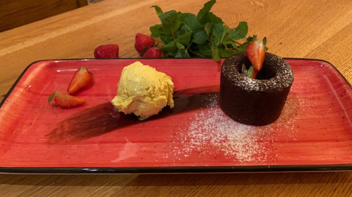 cremă pe bază de cacao, grăsimi vegetale, făină de grâu, albuș de ou, sirop de glucoză, margarină, amidon, aromă rom, zahăr pudră, servit cu înghețată de vanilie